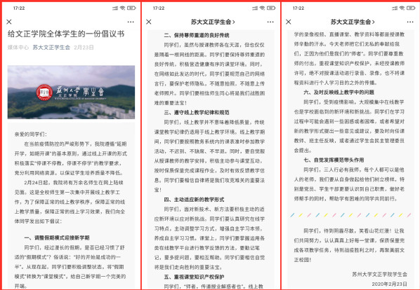 开学前,面向家长和学生发布了《线上教学安排告知书》,明确了线上教学的形式和要求;面向学生发起了《给文正学院全体学生的一份倡议书》,号召全体同学调整状态适应新的教学环境和形式,同时在教学过程中尊敬教师、遵守纪律、尊重知识产权保护,为其他同学做好表率。