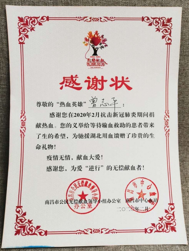 对此次疫情,曾老师说:“我是血站名册上的重要一员,是省级银奖、全国铜奖的献血志愿者。这个时候,不出行,人自危,血站最需要有人出来,那我是‘疫’不容辞啊!”