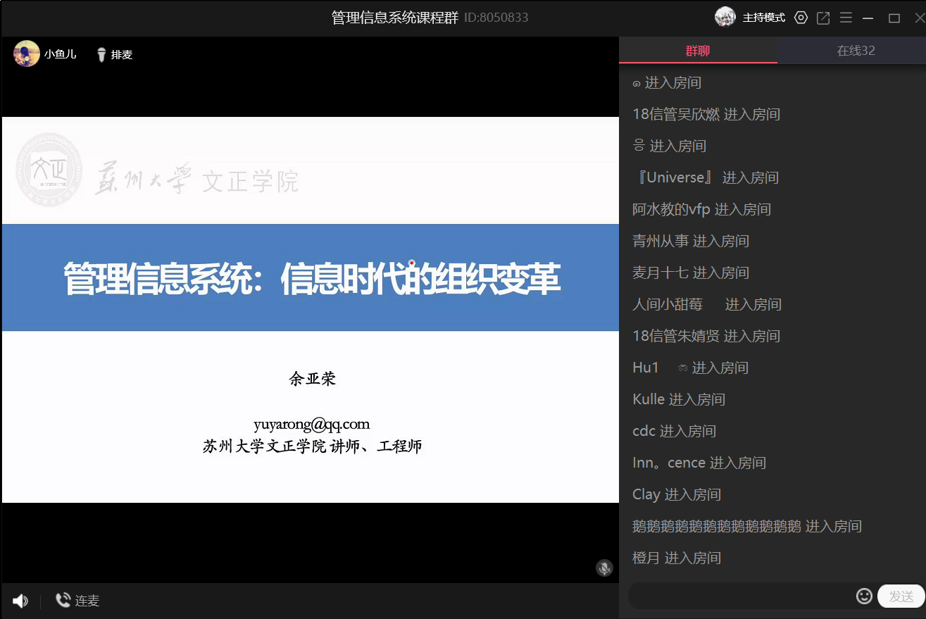 然而一堂成功的网课上下来,除了老师的努力外,如何调动学生的学习积极性是重点,在这一过程中课代表的职责就不可忽视了。为了更好的保证每一个同学不被落下,每门课的课代表都至少对了3次群里面的人数,有时候为了跨年级跨专业“抓人进群”还会拜托班级的各种班委一起帮忙。在清点课程群人数的过程中还发生了另一件趣事,信管班主任徐丹丹老师在核对课程群的人数时发现每个群里面都多了一个人,经过反复核对后才发现是一个叫“q群管家”的机器人,问了同学才知道这是群里面课代表怕同学们错过上课时间,为了提醒同学们准时上课设置的。在上课前为了保证所有同学都准时在线,班委们想出了各种点名方式,有上麦点名,群接龙,发学号等等方式,没有到的同学还会私敲让其进直播间。