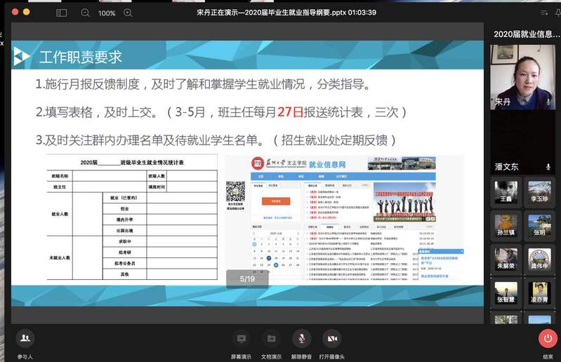 宋丹围绕工作职责要求、考核条例变化、关键时间节点以及相关事项提醒四个方面对2020届毕业生就业工作进行了详细部署和指引。就业指导要贯穿政策研读,做好调研,加强引导,熟知流程,严守核查,不忘服务,她希望各位毕业班班主任近期能召开一次班会,用好两个工具,每月梳理情况,善用时间节点,共同推进精准就业,提高就业质量。同时,介绍了“三支一扶”、征兵等政策, 梳理了近期网络招聘会的情况。