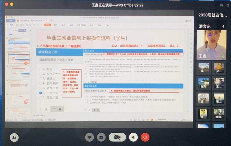 王鑫就2020届毕业生就业手续办理一览、毕业生报到证办理流程、就业材料收取、信息上报教程、就业协议书和推荐表重新补办以及毕业生档案查询进行了详细讲解。在就业材料收取注意事项方面,编了“一章回老家,两章去单位”的口诀方便同学和老师识记。在毕业生就业信息上报操作流程中,提醒学生要做两步选择和一步填报,“返回原籍选2、4,去就业地选2、1或2、2”的口诀好记又便捷。