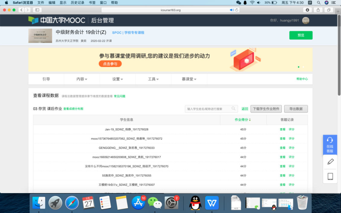 黄奕老师选用mooc 腾讯会议 qq群答疑慕课堂提问的方式,利用慕课平台上的网课作为学生学习的开篇,让学生对一章的知识点有基本的了解,再在学生看完网课后,给学生在线教学,通过语音和分享屏幕的方式,最大程度还原上课的状态。上课过程中黄老师会通过慕课堂app随机抽取学生回答问题,并给学生的回答评分。一章结束后,黄老师会在慕课平台上给学生布置作业,并在线批改,最后利用qq群进行答疑。黄老师表示,网课对所有人来说都是新事物,一开始觉得有些无所适从,第一周摸索后就逐渐找到了适合自己的方式。现在通过腾讯会议、分享屏幕,学生可以非常清晰地看到ppt,上课过程中黄老师会随时找同学回答问题,让学生保持上课的紧张状态,间接监督学生。学生对目前的教学方式反馈都不错。黄老师认为现在的教学相比线下有自己的优势,比如学生可以在平台反复看网课,还可以随时qq联系老师,老师也可以随时答疑解惑。通过四个工具的全方位支持,黄老师基本能覆盖到课程教学的多种需求,完成教学任务。