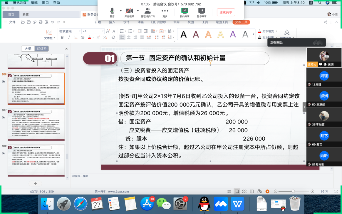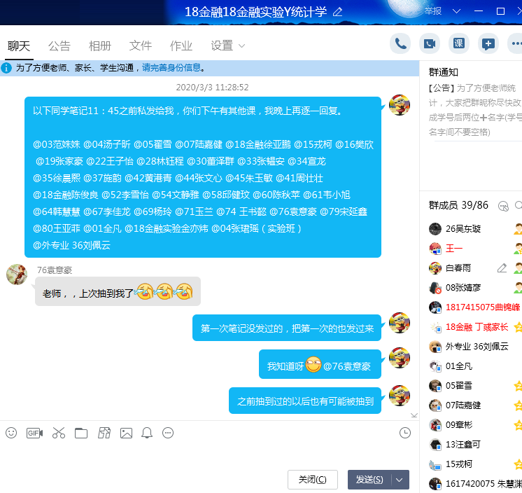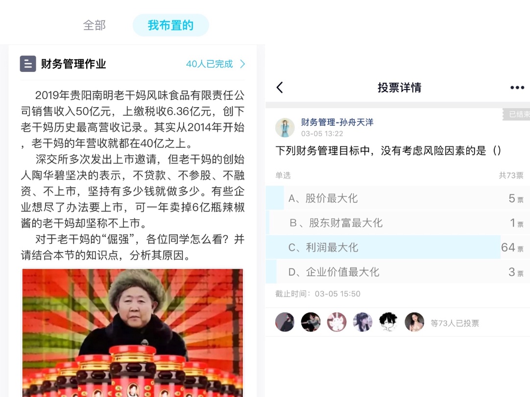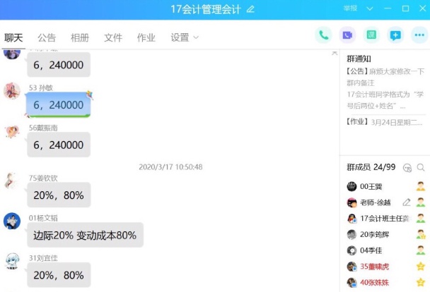 孙舟天洋老师的《财务管理》课程采取“mooc平台 qq群”的方式,孙老师引进了慕课平台上的课程资源,指引学生学习网课,课程内容需要时,还会配以其他的视频资料,并在平台上进行随堂测试、章节测试等,检查学生对课程知识点的掌握程度,对于不认真观看网课或测试结果不理想的同学,孙老师会进行督促和指导;与此同时,孙老师用qq群来进行辅助教学。课程开始前,孙老师就在群内上传了线上教学方案和考核要求,加强学生的学习紧迫感;每次课前,课代表都会通过qq接龙让学生进行签到;上课时,针对网课中的重点要点、疑难问题,孙老师会用qq群进行讲解答疑、突出重点,并在群中利用qq投票、作业等功能,设置选择题、讨论题及作业,学生学习都很认真,教学效果良好。在五周的线上教学过程中,孙老师发现结合课程的特点,以学生学习效果为中心,选择合适恰当、灵活多样的教学方式,对实现线上线下“实质等效”尤为重要。孙老师认为线上授课不单单是要把课讲完,更关键的是如何让学生在指导下学习,充分发挥学生自身的主观能动性。