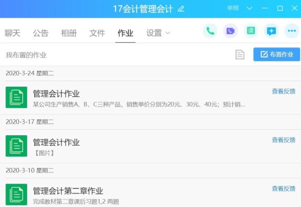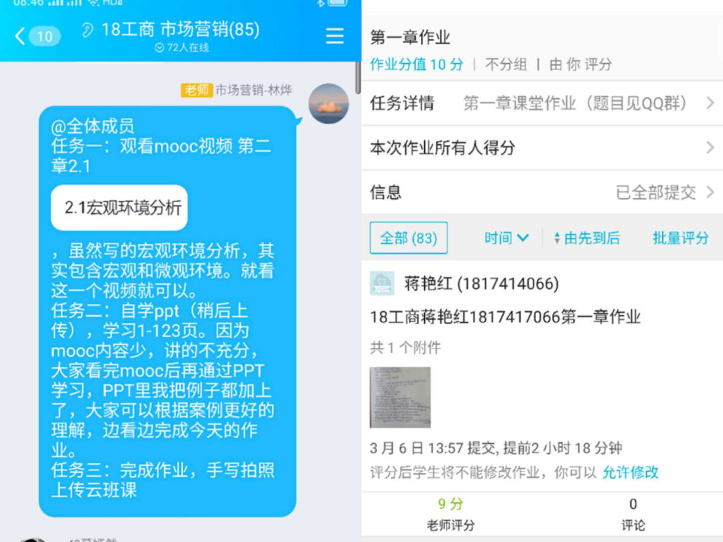 林烨老师根据课程目标及班级情况不同,选择了不同的线上教学方式。市场营销、市场调查、品牌管理三门课程采用mooc平台 qq云班课的授课方式,国际市场营销则采用腾讯课堂直播云班课的授课方式。每门课开课前都在qq群上传这门课的线上教学方案和要求,让学生心中有数。并且多平台结合,发挥各平台的优势,教学效果良好。18工商的市场营销是一门专业必修课,林老师除了让学生通过mooc平台学习外,还将ppt上传到qq群让学生自学,并在群里进行答疑。此外还会布置相关的作业,让学生上传到云班课平台,教师可以直接在该平台批改,及时反馈学生作业中出现的问题。17营销的品牌管理是一门专业选修课,林老师除了选用mooc平台资源外,还会为学生补充拓展资料,并布置一些创新实践型的作业,锻炼学生的实践技能,激发学生的学习兴趣,取得了良好的效果。