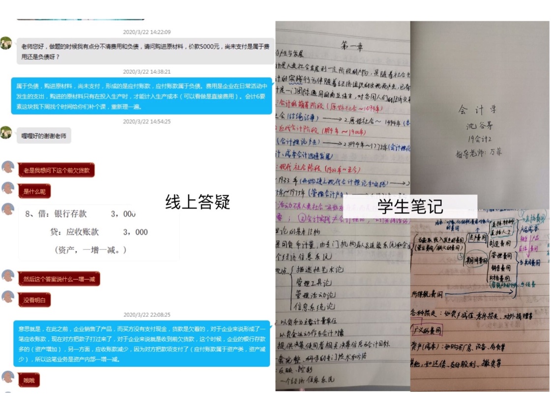 万菲老师任教的会计学和财务会计学都选择了引进中国大学慕课平台上的课程,辅助以腾讯课堂的直播课进行巩固,另一门重修课程也是在腾讯课堂直播完成授课。每节课前十分钟,万老师会通过云班课软件进行考勤,大部分同学会在规定时间完成考勤,少部分同学出现迟到的情况,万老师会及时通知提醒。万老师认为,线上课程的优势在于学生可以随时上线进行学习,并且进行多次学习;但线上课的弊端也存在,很大程度上需要学生自主学习,而学生能否做到在规定的时间内高效的完成线上学习,这需要打一个大大的问号?事实证明,部分同学的线上学习效率并不高,课后的作业完成情况也存在一些问题,但万老师会定期在平台上检查学生的学习数据,对学习落后的同学点对点督促,并通过直播课的形式帮助同学巩固学习内容;学生遇到难题会通过qq联系,万老师也会及时解答。课程进行到第五周,上课情况整体良好。