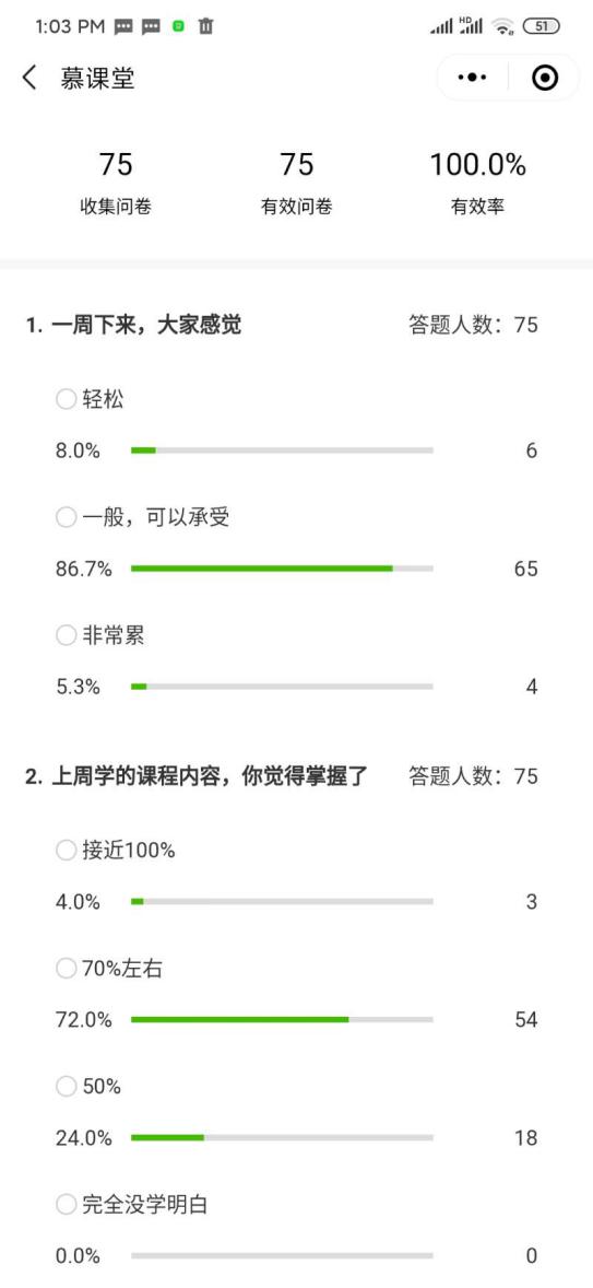 胡迪老师的教学方式都是慕课慕课堂直播。慕课主要是让学生观看教学视频,利用优质的网络资源让学生接触到其他学校优秀教师的讲授,加深对知识的理解。课后,学生需完成相应的单元测验和作业来检测学习效果,此外慕课平台上还有作业互评功能,让学生相互观摩彼此的作业,这个功能效果还是不错的,从学生的互评结果看,不仅学生自己加深了对知识点的理解,还能看到别人易发生的错误从而避免自己下次再犯。