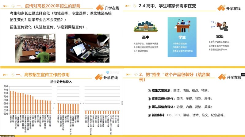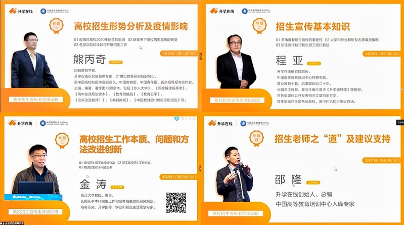 知名教育学者、升学在线研究院首席专家、21 世纪教育研究院副院长熊丙奇带来第一讲《高校招生形势分析及疫情影响》,他就疫情对高校2020年招生的影响、新高考下高校招生宣传的转变以及各层次院校该如何开展招生工作三个方面展开详细讲解。第二讲《如何成为一名合格的招生宣传老师?》由中国高等教育培训中心特聘专家、升学在线研究院院长程亚主讲,他从多角度分析了做好招生宣传的重要性,并进行了大学和专业解析,讲解了志愿填报策略以及招生宣传技巧和生源三段拦截法。第三讲《高校招生工作本质、问题和方法改进创新》主讲人为浙江大学教授、博导、原浙大招生处副处长金涛,他阐释了高校招生工作的本质,分析了当前招生宣传存在的问题,并就招生工作内容的定位和目标边界、招生工作创新的思路进行了详细分析。在第四讲中,升学在线总编、中国高等教育培训中心入库专家邵隆与大家分享了招生老师之“道”及建议支持,他表示招生的本质就是销售,高校要把招生当业务做,把招生这个“产品”包装好,把学校推广出去,让更多优秀的学生报考,并组织全体培训老师进行线上结业测试。