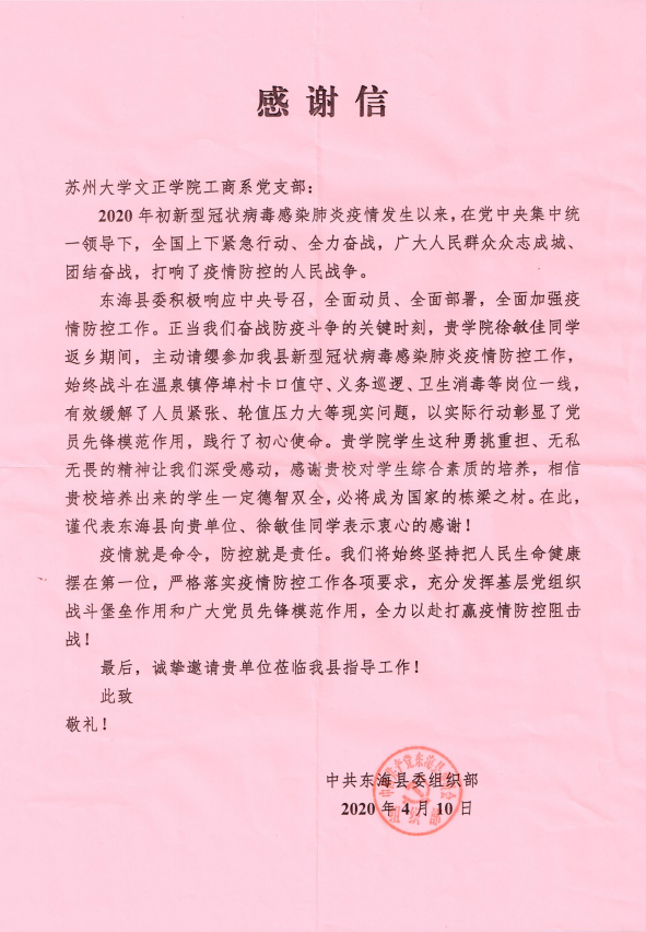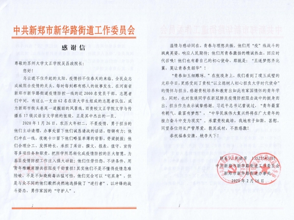 自新冠肺炎疫情发生以来,我院学生响应国家号召,在做好自身安全防护的前提下,积极投身各地区的疫情防控阻击战中。近日,我院2016级工商管理专业徐敏佳和2017级汉语言文学专业张琰两名同学,因在抗疫工作中的突出表现荣获当地县委组织部和街道工作委员会的来信表彰。