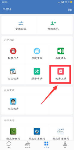 三、填写方式:1.打开“企业微信”app。2.点击底部菜单栏“工作台”。3.进入“工作台”后,可见“健康上报”,点击“健康上报”进行线上填写。必填项目必须填写,没有可以填“无”,否则无法提交。“教师基本信息上报”只需填写一次,“教师每日健康上报”需每天填写。填写完毕后点击“提交”即可。具体流程如下:
