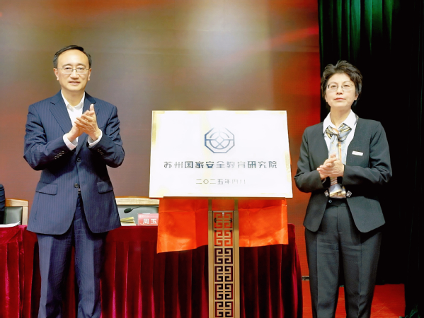 周玉玲致欢迎辞,她表示,苏州国家安全教育研究院揭牌成立,对于学校创建国内一流高水平应用型大学具有里程碑意义。研究院将立足三个维度,打造具有苏州特色的国家安全教育体系:一是理论维度,深化国家安全教育研究;二是实践维度,创新国家安全教育模式;三是服务维度,打造国家安全教育智库平台。学校将以高度的政治责任感和使命感,不断提高国家安全教育理论研究和实践探索的质量和水平,为维护国家安全和社会稳定作出贡献。