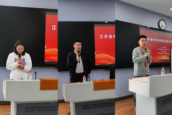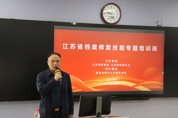 黄涧秋致辞,他对江苏省档案馆和档案学会的领导以及全省来参训的学员的到来表示热烈欢迎。他简要介绍了学校的办学历程和本次培训班的整体课程安排。他表示,江苏作为文化大省,历史悠久、典籍丰厚,从苏州的吴文化遗存到全省各地的珍贵档案,都需要我们以专业的技艺、敬畏的心态去守护。此次培训班的举办,正是呼应时代需求,为全省档案工作者搭建一个技艺传承、经验交流、协同创新的平台。并向学员提出三点期望:一是做“静得下心”的学习者,二是做“开得了眼”的思考者,三是做“联得起手”的同行者。