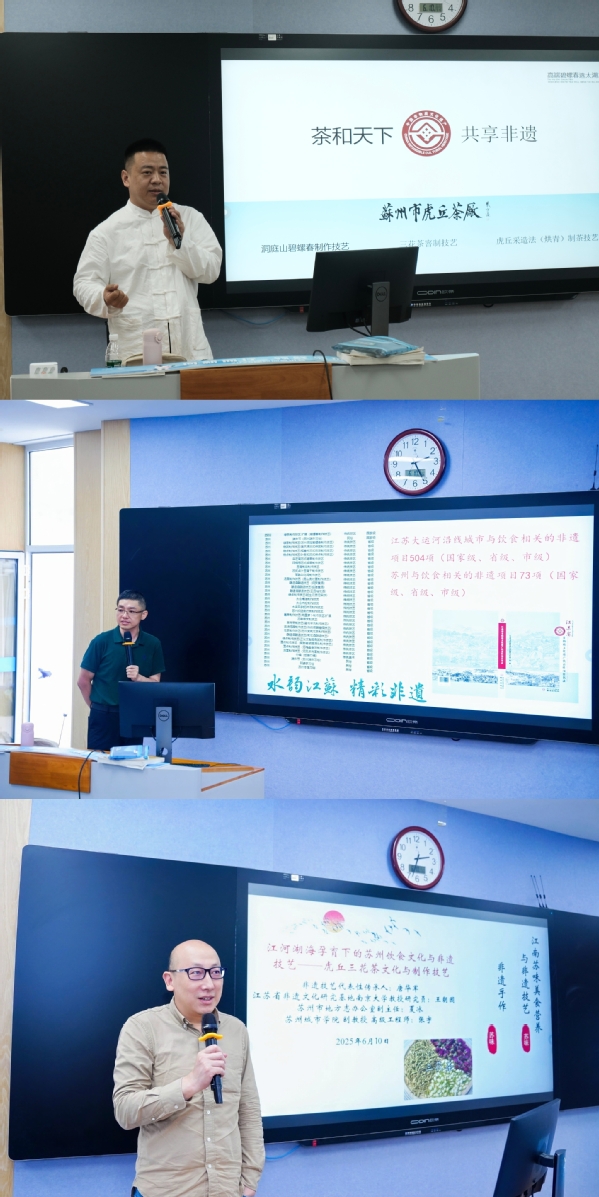 活动中,吴中区政协委员、虎丘茶制作技艺传承人、碧螺春制作技艺代表性传承人、虎丘三花茶窨制技艺代表性传承人唐华军先生率先登场。他以“虎丘三花茶文化与制作技艺”为题,深入浅出地解读了苏州茶文化的精髓及其背后承载的匠心精神与非遗价值。唐华军先生还现场展示了虎丘三花,并带领140多位学生一同泡制茉莉花冷却茶,让在场师生仿佛亲历了茶叶从采摘到窨制的每一个精妙环节,深刻体验了非遗技艺的魅力。
