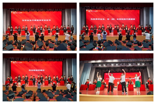 典礼现场,导师们为毕业生颁发毕业证书;校、院领导宣读优秀毕业生及校(院)长特别奖表彰名单并颁奖;向校友联络员代表颁发聘任证书仪式,进一步凝聚校友力量、传承校园精神;毕业生以9人一组为单位,接受导师拨穗正冠并颁发学位证书,定格荣誉瞬间。