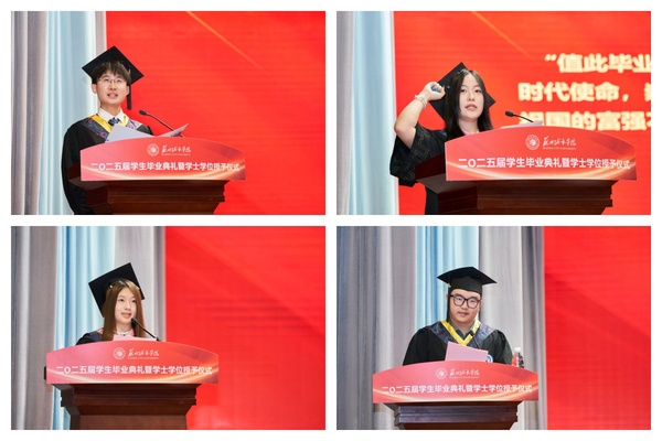 来自四个学院的毕业生代表依次上台发言。智能制造与智慧交通学院21级机械电子工程专业丁迅以校训精神为引,激励大家奋勇前行,立志以专业所长服务社会。城市治理与公共事务学院21级人力资源管理专业杨煜深情回顾四年同窗情谊,寄语大家不负韶华,继续前行,踔厉奋发,逐梦远航。城市文化与传播学院21级汉语言文学专业毛馨祝福敬爱的老师们工作顺利,桃李芬芳,祝福深爱的母校母院大展宏图,再谱华章。计算科学与人工智能学院21级计算机科学与技术专业张亚川以“回首:岁月鎏金处的青春浮雕”“感恩:三春化雨般的温情长歌”“展望:赴山海之约的壮志长行”为主线,向母校、师长及同窗,献上最诚挚的谢意。四位代表与全体毕业生共同宣讲毕业誓词,铿锵誓言在会场久久回荡。