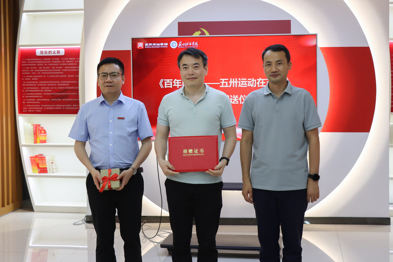 今年恰逢五卅运动爆发100周年,也是中共苏州独立支部建立100周年,活动现场播放了由苏州市档案馆与苏州广电总台合作拍摄的专题纪录片《百年回响——五卅运动在苏州》。该片以五卅运动在苏州为主线,整合档案文献、历史影像和人物采访等资源,带领大家重温热血沸腾的岁月,全景式展现五卅运动对中国革命的重大意义以及苏州人民不畏强权、团结抗争的伟大历程。沈斌、金磊、张振宇共同完成视频捐赠。