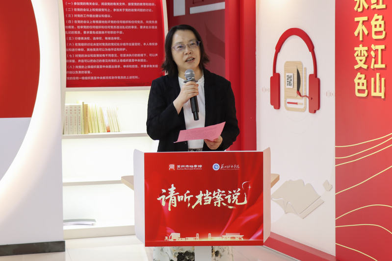 苏州市档案馆宣传教育处副处长池景彦,我校党委组织部、图书馆(档案馆)、计算科学与人工智能学院、城市治理与公共事务学院教师代表、学生党员代表共同参加活动。