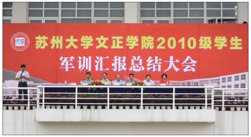 9月13日下午,我院2010级新生军训总结大会院运动场举行。驻苏73041部队直工科科长、军训团团长陈旭松中校,驻苏73041部队直工科参谋、军训团副团长兼参谋长李建忠少校,校党委常委、副校长、文正学院院长殷爱荪,校人民武装部部长、军训团政委邓国林,以及我院常务副院长徐子良、党委书记吴昌政、副院长施盛威等在主席台就座。总结大会由校学生工作部(处)长、军训团政委张国华同志主持。