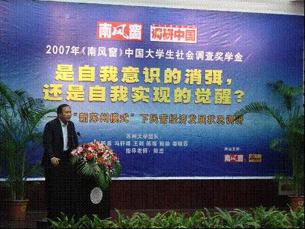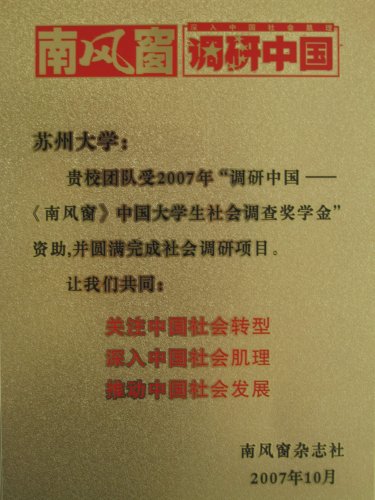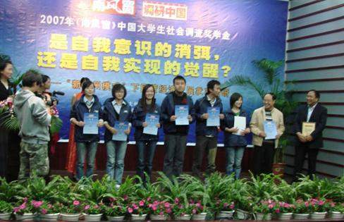 “调研中国――《南风窗》中国大学生社会调查活动”是由南风窗杂志社于2005年发起和组织的,以鼓励和资助中国在校大学生进行社会实践和社会调查的公益活动。活动旨在为关注当下中国社会各方面状况并有兴趣对其进行调查、研究的大学生团队提供必要的资金支持和实操合作,以促进大学生对社会发展现实的深入接触和思考。