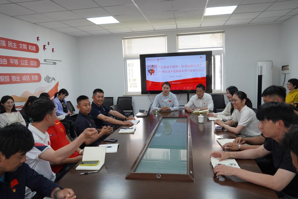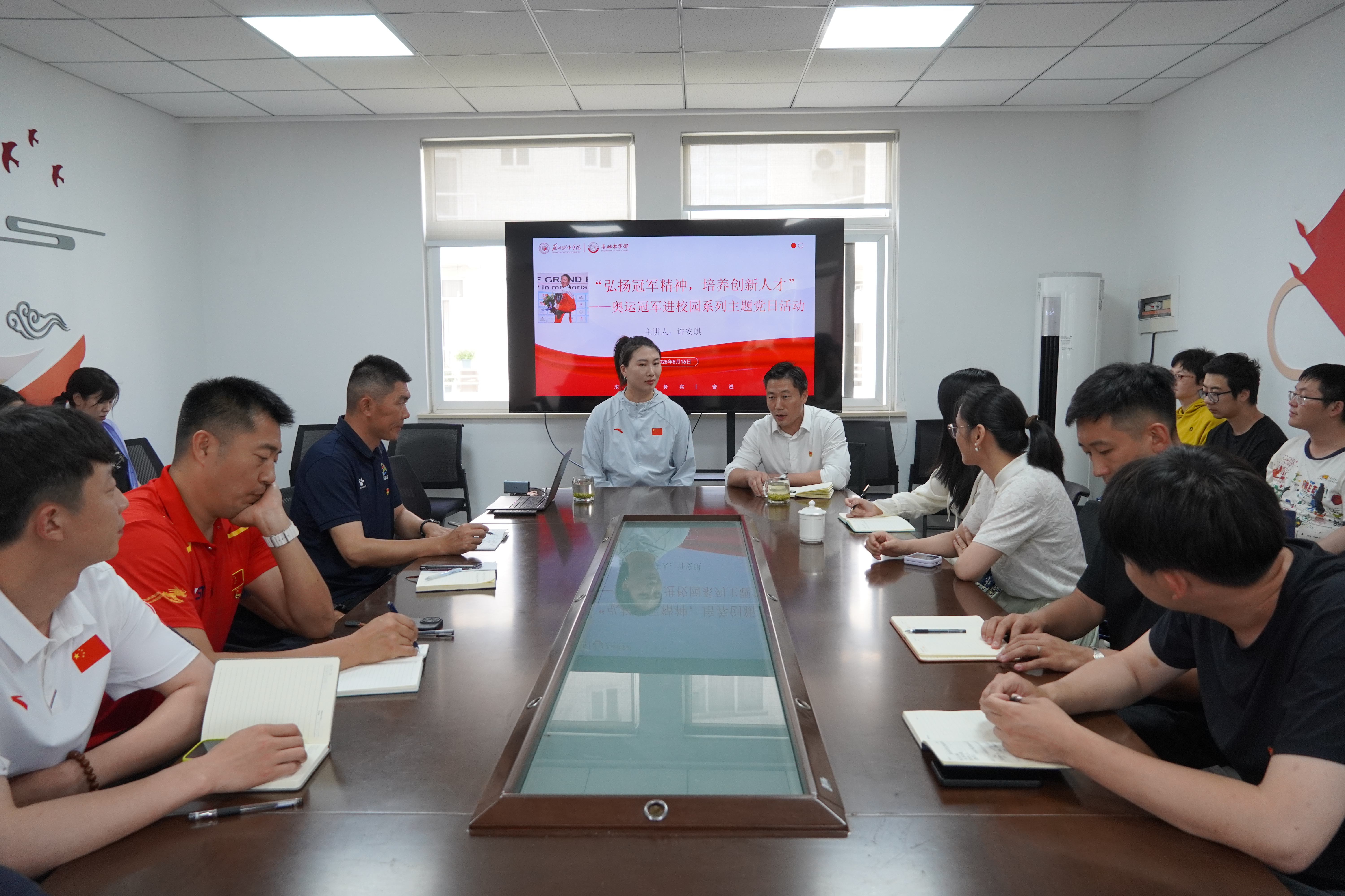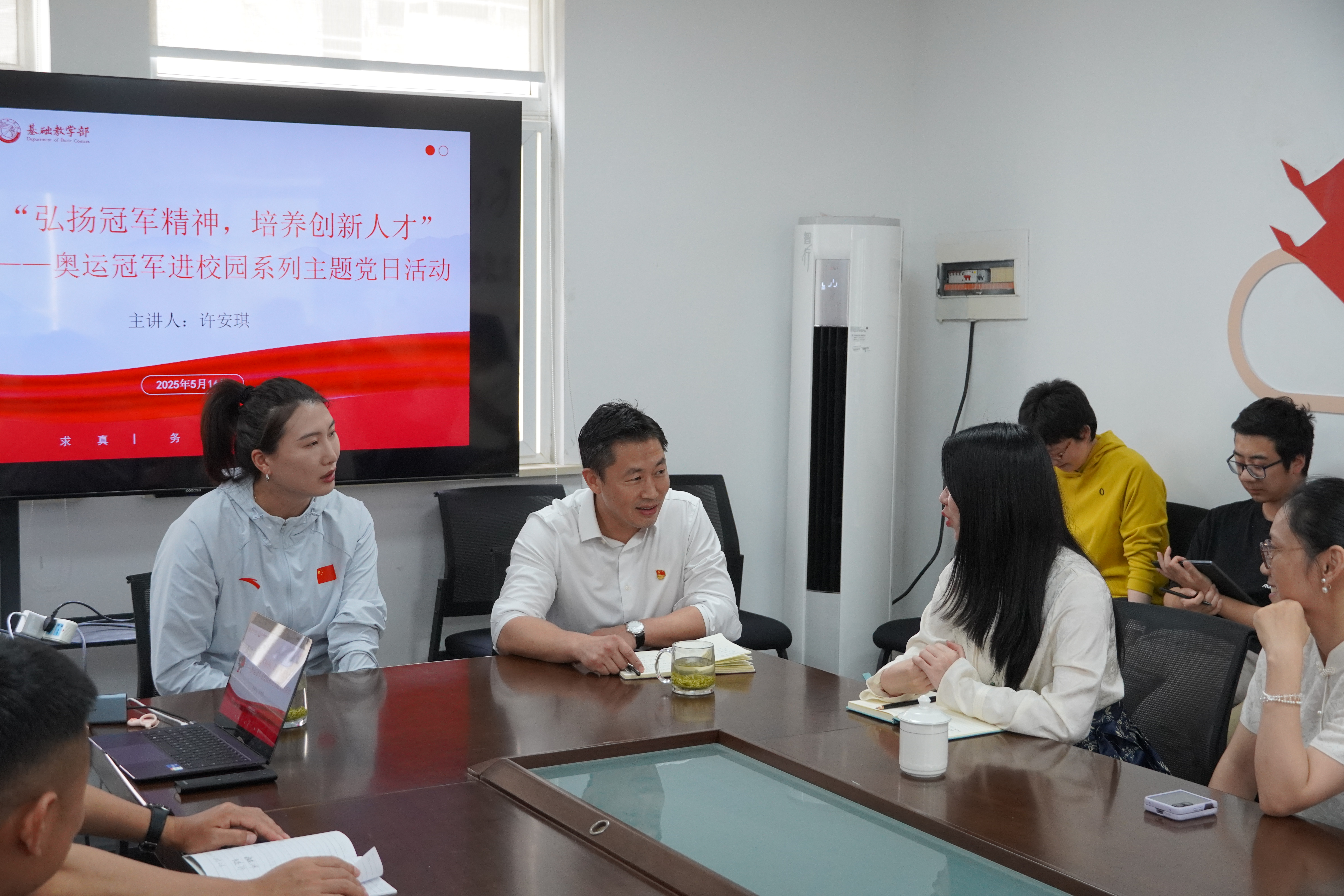 为深化新时代教师队伍建设改革,将体育强国战略融入基层党建实践,5月16日,基础教学部开展“奥运冠军进校园”系列主题党日活动,特邀2012年伦敦奥运会女子重剑团体冠军、2015年女子重剑世界杯个人赛冠军许安琪,以“弘扬冠军精神,培养创新人才”为主题开展沉浸式党性教育。活动由基础教学部党委书记、主任李勇主持,教职工党员参与。