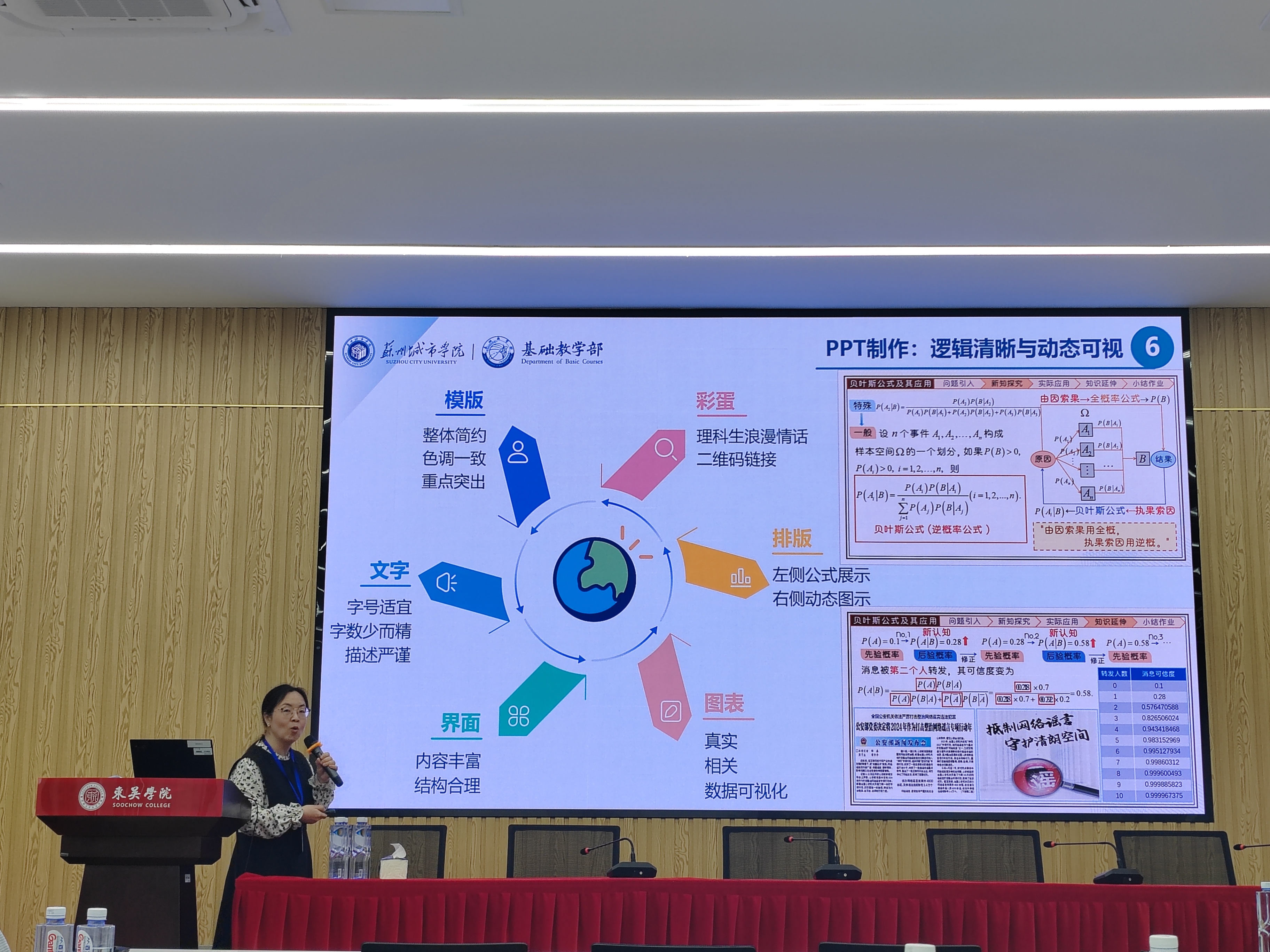 宋娟以赛事章程的系统解读为切入点,结合我校2024年赛事承办经验,深度剖析竞赛评审标准演变趋势及流程优化要点。在核心经验分享环节,重点围绕《贝叶斯公式及其应用》参赛课例,从选题策略、资料整合、内容设计、课程思政、教学节奏、ppt制作、教师表现、团队协作这八个方面展开论述,包括课程思政的自然渗透策略、教学节奏的精准把控技巧以及多媒体课件的视觉传达要义等,同步解析教师仪态管理、团队协同备赛等关键要素。