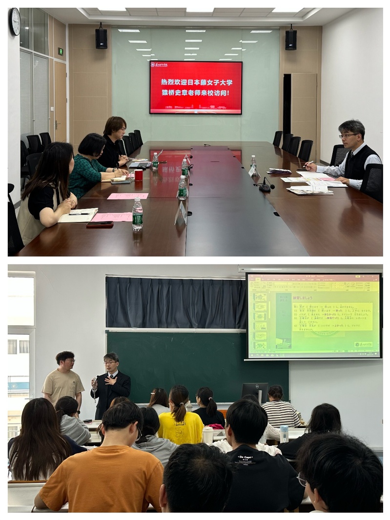 5月19日上午,日本藤女子大学全球教育中心(国际交流室)学长辅佐、係长猿桥史章来校访问,我校国际合作交流处合作交流科科长邓小玲、综合科科长梅莹、合作交流科副科长潘涵、城市文化与传播学院日文系讲师程青参与接待及交流座谈,双方就两校基本情况及共同探索深化两校间师生友好交流开展深入探讨。座谈会后,猿桥史章来到我校城市文化与传播学院日文系主任助理、讲师李凌飞老师所教授的2024级日语专业《基础日语2》课堂,与师生开展亲切交流。