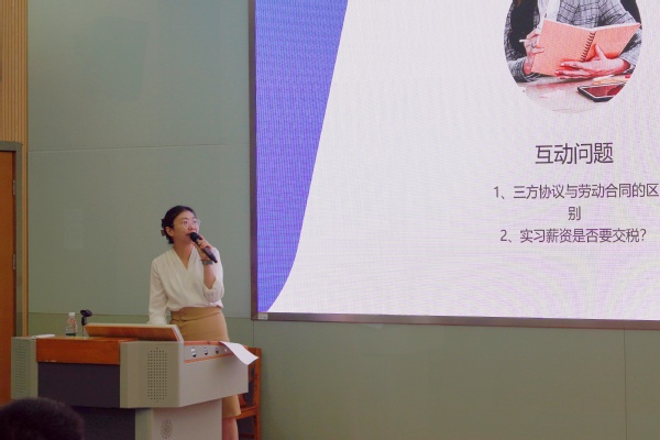 在讲座前期,学院面向高年级学生尤其经济困难学生广泛征集在求职和实习过程中遇到的困惑,在互动环节,秦杨逐一解答同学们提问的“三方协议和劳动合同有什么区别?”“实习期间受伤能否认定工伤?”等问题。讲座的最后,针对劳动者常见的维权误区,秦律师提出协商先行、投诉调解、仲裁诉讼三步走策略,并建议保留工作过程中产生的证据,避免因举证不足影响维权效果。