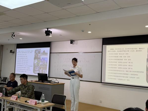 随后,退役大学生士兵代表、城市治理与公共事务学院23级法学专业李璐瑶同学分享了她的军旅经历。她鼓励同学们积极投身军营,寻找属于自己的报国答案。