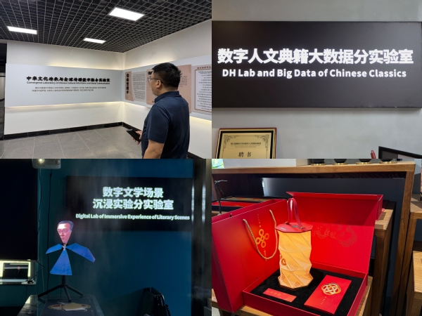 交流中,曾元祥副院长阐述了学科融合的“双引擎”策略,通过引进复合型师资,打破学科壁垒;以创新实践项目为抓手,激发学生参与热情;同时认可文创大赛价值,将积极组织川大学子参赛,搭建两地创意交流的桥梁。邱树雄主任引导调研团实地参观了四川省中华文化传承与全球传播数字融合实验室,下含数字人文典籍大数据、数字多模态符号认知、数字文学场景沉浸等分实验室。通过数字化赋能,古籍文献“活化”为动态图谱,文学场景转化为交互体验,这些成果为我院产教融合与实验室建设提供了重要参考的“川大方案”。