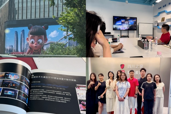 午后,调研团踏入成都瑞和麦田广告有限公司。创始人杜海清以“数字文创领域开拓者”的视角,向师生展示公司打造的巨型裸眼3d屏经典案例。在座谈中,王静教授围绕产教融合模式、人才培养方向与对方深入研讨,双方就“课程内容与行业需求精准对接”“企业真实项目嵌入教学体系”达成共识。23广告班班长周方圆、学委薛晶晶结合专业学习困惑,请教行业发展趋势与职业成长路径,杜海清以“技术迭代与创意坚守并重”的建议,为学生指明方向。