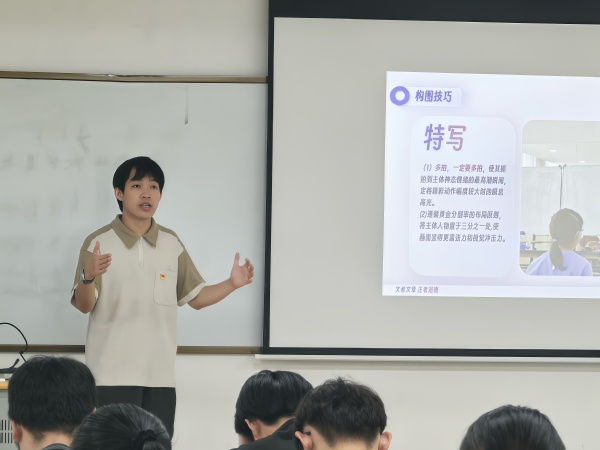 讲座中,苏建维同学凭借自身丰富的实践经验,围绕暑期社会实践报道与宣传的艺术与技巧展开分享,内容涵盖拍摄、照片与视频稿件制作以及通讯稿撰写等方面。他通过抛出问题并逐步讲解的方式,使同学们深入了解到摄影摄像技术的基本要素以及通讯稿的组成部分和重要性。