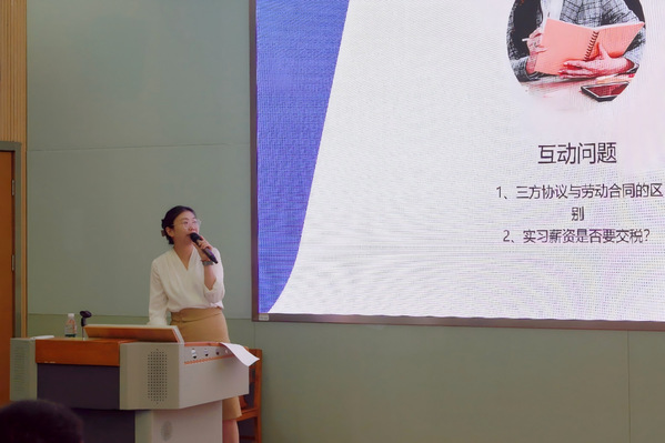秦杨立足《中华人民共和国劳动法》《中华人民共和国劳动合同法》等相关法律法规,结合多年实务经验,深入剖析“00后”职场新人维权典型案例,围绕毕业生最为关注的十大劳动权益问题进行了系统讲解。她重点就试用期陷阱、阴阳合同、社保缴纳等常见职场“套路”,以案释法,揭示用人单位可能设置的隐蔽侵权行为,提醒同学们警惕口头承诺、工资分拆发放等容易忽视的细节问题。在互动环节,现场气氛热烈,同学们就劳动合同签订、试用期权益保障、社保缴纳等实际问题踊跃提问,积极交流。