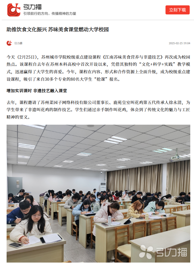 今天(2月25日),苏州城市学院校级重点建设课程《江南苏味美食营养与非遗技艺》再次成为校园热点。该课程自去年在苏州本科高校中首次开设以来,凭借其独特的“文化 科学 实践”教学模式,迅速赢得了大学生的喜爱。今年,课程在内容、形式和合作资源上全面升级,成为校级重点建设课程,吸引了来自30多个专业的80名大学生“抢课”报名。