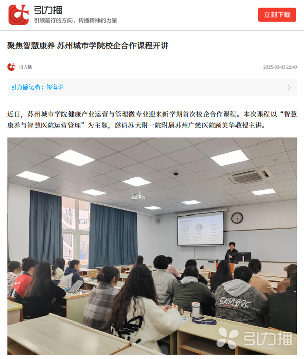 近日,苏州城市学院健康产业运营与管理微专业迎来新学期首次校企合作课程。本次课程以“智慧康养与智慧医院运营管理”为主题,邀请苏大附一院附属苏州广慈医院顾美华教授主讲。