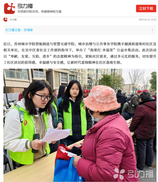 近日,苏州城市学院智能制造与智慧交通学院、城市治理与公共事务学院携手越溪街道珠村社区及相关单位,在吴中区委社会工作部的指导下,举办了“海棠红·幸福里”公益市集活动。此次活动以“奉献、友爱、互助、进步”的志愿精神为指引,紧贴社区需求,通过多元化的服务,切实提升了社区居民的获得感、幸福感与安全感,让新时代雷锋精神在社区落地生根。
