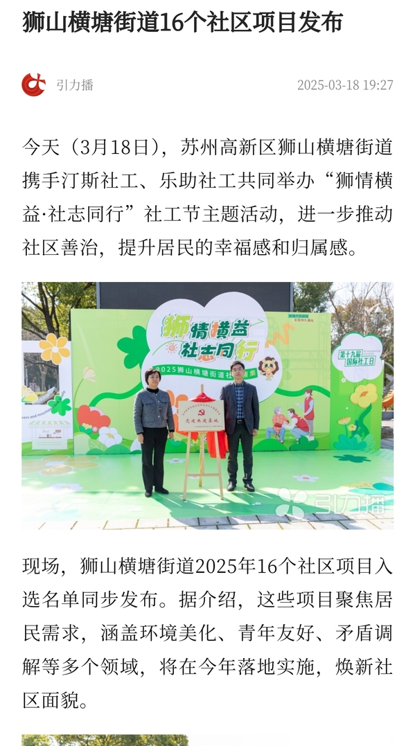 今天(3月18日),苏州高新区狮山横塘街道携手汀斯社工、乐助社工共同举办“狮情横益·社志同行”社工节主题活动,进一步推动社区善治,提升居民的幸福感和归属感。