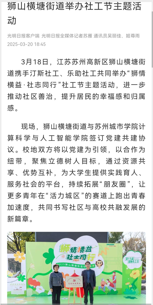 现场,狮山横塘街道与苏州城市学院计算科学与人工智能学院签订党建共建协议。校地双方将以党建为引领,以合作为纽带,聚焦立德树人目标,通过资源共享、优势互补,为大学生提供实践育人、服务社会的平台,持续拓展“朋友圈”,让更多青年在“活力城区”的赛道上跑出青春加速度,共同书写社区与高校共融发展的新篇章。