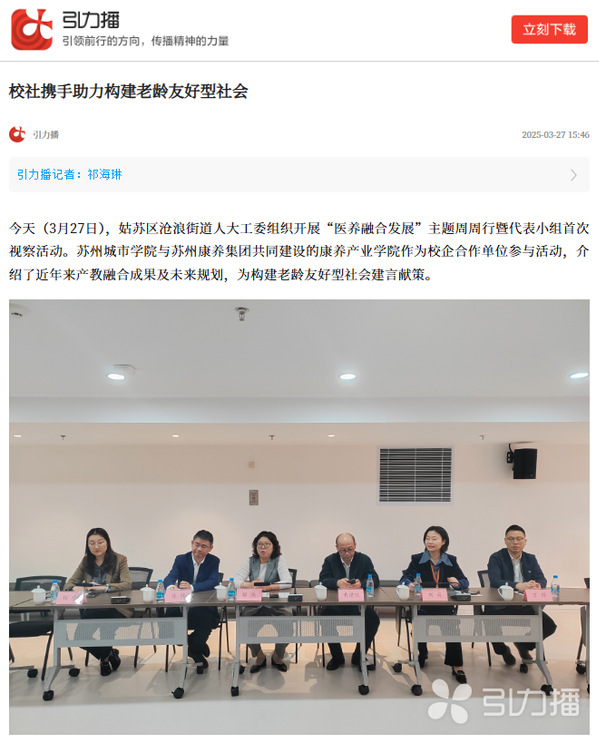 今天(3月27日),姑苏区沧浪街道人大工委组织开展“医养融合发展”主题周周行暨代表小组首次视察活动。苏州城市学院与苏州康养集团共同建设的康养产业学院作为校企合作单位参与活动,介绍了近年来产教融合成果及未来规划,为构建老龄友好型社会建言献策。
