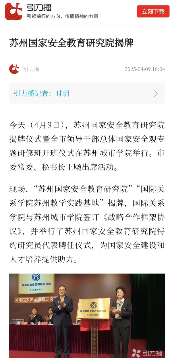 据介绍,苏州国家安全教育研究院将有效整合资源,打造集学术研究、决策咨询、社会服务于一体的新型智库平台,推动总体国家安全观教育改革发展。
