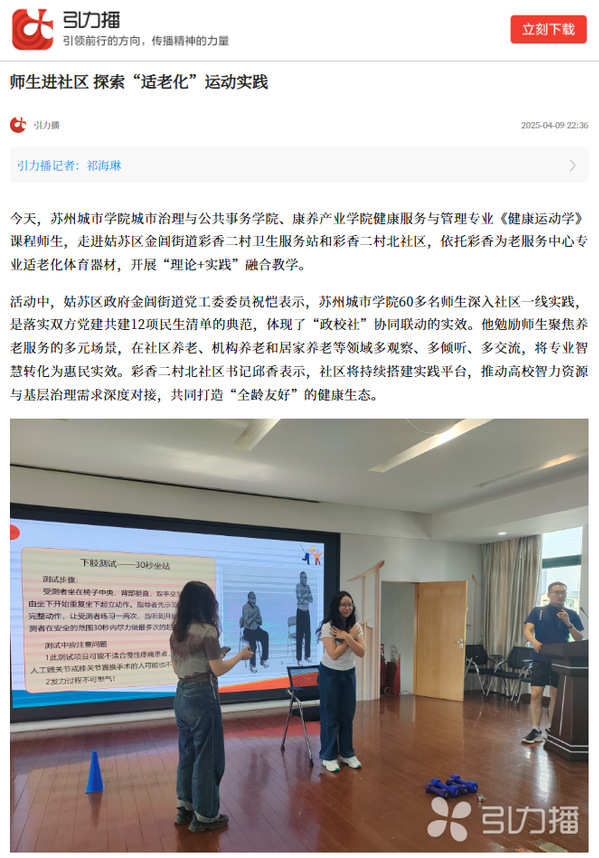 今天,苏州城市学院城市治理与公共事务学院、康养产业学院健康服务与管理专业《健康运动学》课程师生,走进姑苏区金阊街道彩香二村卫生服务站和彩香二村北社区,依托彩香为老服务中心专业适老化体育器材,开展“理论 实践”融合教学。