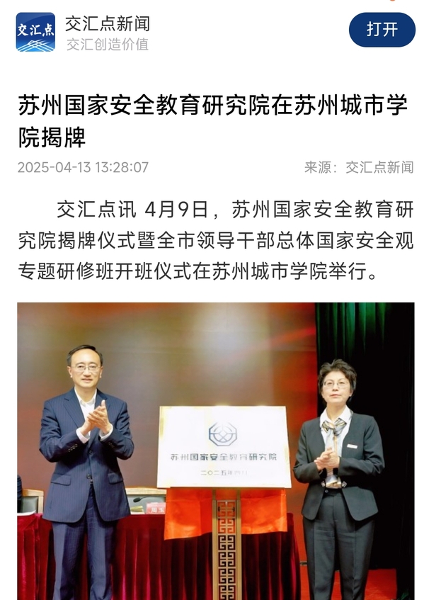 4月9日,苏州国家安全教育研究院揭牌仪式暨全市领导干部总体国家安全观专题研修班开班仪式在苏州城市学院举行。