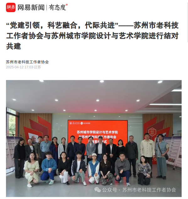 为加强地方社会组织与高校的联系,促进老科技工作者与青年学生的交流与合作,推动艺术与科技工作的深度融合,4月11日上午,苏州城市学院设计与艺术学院与苏州市老科技工作者协会开展党建共建。共建仪式在苏州城市学院国际交流中心举行。
