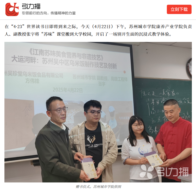 活动特别邀请吴中乌米饭非遗传承人走进校园,展示乌米饭的制作技艺并向学生代表赠送《美食家》书籍。校企双方签署共建协议,以“阅读 实践”“文化 产业”的多维模式,为青年学子铺就一条感知江南文化的鲜活路径。