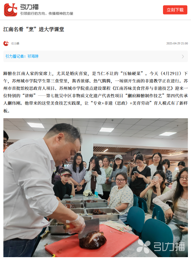 蹄髈在江南人家的宴席上,尤其是婚庆喜宴,是当仁不让的“压轴硬菜”。今天(4月29日)下午,苏州城市学院学生第三食堂里,酱香浓郁、热气腾腾,一场别开生面的非遗教学正在进行。苏州市首批馆校思政育人项目、苏州城市学院重点建设课程《江南苏味美食营养与非遗技艺》迎来一位特别的“讲师”——第七批吴中区非物质文化遗产代表性项目“蒯府蹄髈制作技艺”第四代传承人蒯伟刚。他带来的这堂美食技艺实践课,让“专业 非遗(思政) 美育劳动”育人模式有了新样板。