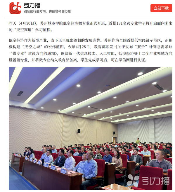 低空经济作为新型产业,当下正呈现出蓬勃的发展态势。苏州作为全国首批低空经济示范区,正积极构建“天空之城”的宏伟蓝图。今年4月28日,教育部印发《关于发布“双千”计划急需紧缺“微专业”建设方向的通知》,围绕新一代信息技术、人工智能、低空经济等十二个产业领域方向设置微专业,并将微专业纳入教育部备案,学生完成学习后,可在学信网进行认证。