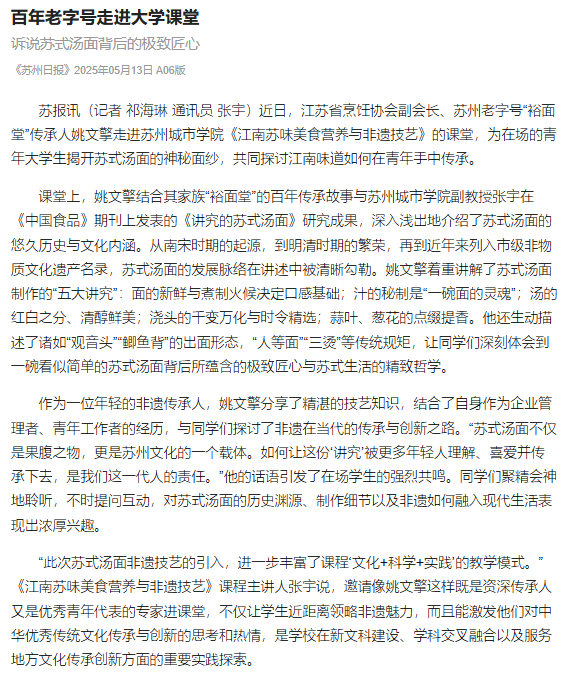 近日,江苏省烹饪协会副会长、苏州老字号“裕面堂”传承人姚文擎走进苏州城市学院《江南苏味美食营养与非遗技艺》的课堂,为在场的青年大学生揭开苏式汤面的神秘面纱,共同探讨江南味道如何在青年手中传承。