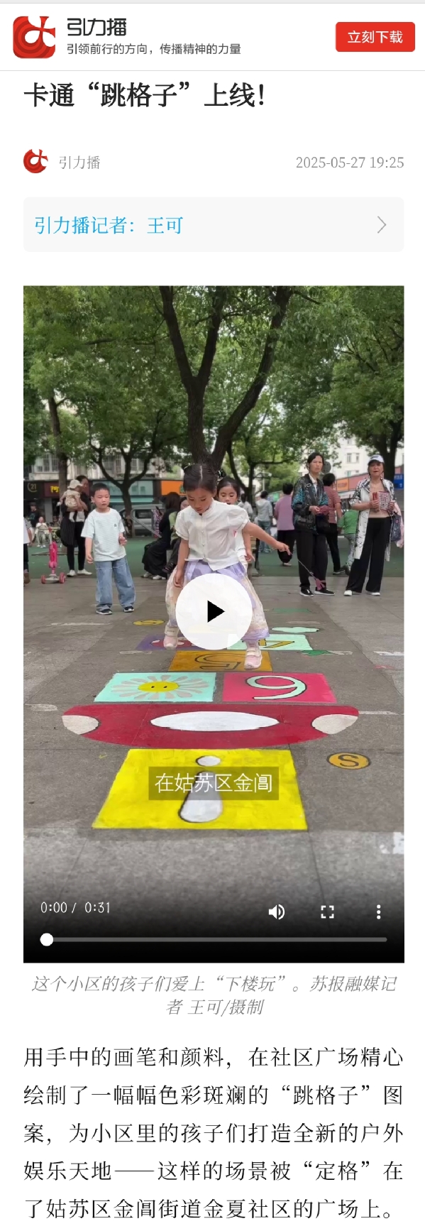 用手中的画笔和颜料,在社区广场精心绘制了一幅幅色彩斑斓的“跳格子”图案,为小区里的孩子们打造全新的户外娱乐天地——这样的场景被“定格”在了姑苏区金阊街道金夏社区的广场上。记者获悉,由苏州城市学院设计与艺术学院的大学生志愿者设计绘制的“跳格子”图案已经让小区的孩子们爱上了“下楼玩”。