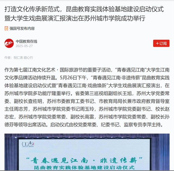 活动现场,“昆曲教育实践体验基地”建设正式启动。该基地由苏州城市学院与江苏省苏州昆剧院共建,是学校主动对接地方资源、搭建非遗传承创新平台的重要举措。该基地已成功入选“2025年度全国高校综合性教育实践体验基地”,标志着非遗教育实践迈出新步伐。