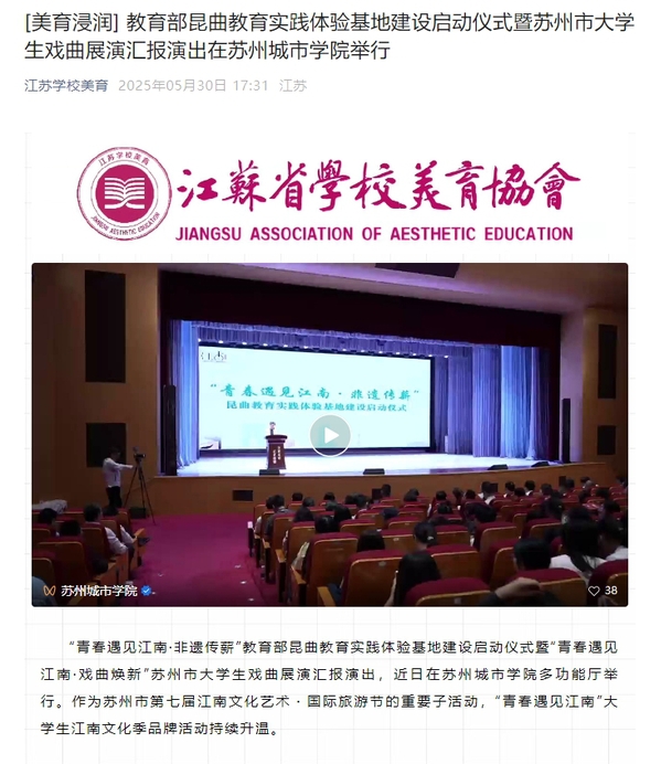 活动现场,“青春遇见江南·非遗传薪”教育部昆曲教育实践体验基地建设正式启动。该基地由苏州城市学院与江苏省苏州昆剧院共建,是该校主动对接地方资源、搭建非遗传承创新平台的重要举措,目前已成功入选“2025年度全国高校综合性教育实践体验基地”,标志着该校非遗教育实践迈出了新的步伐。