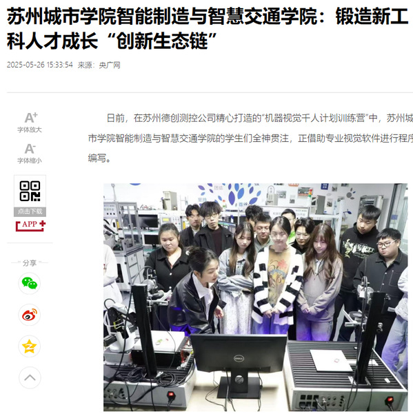 在苏州积极投身建设“全球高端制造基地”的征程中,苏州城市学院智能制造与智慧交通学院正以“地方高校服务地方产业”的使命担当,以立德树人为根本,实现了从理论学习到实践应用、再到竞赛检验和就业转化的完整培养闭环,为新时代高质量应用型人才培养提供了鲜活范本。