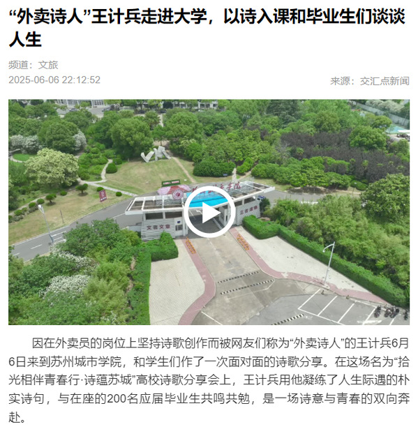 因在外卖员的岗位上坚持诗歌创作而被网友们称为“外卖诗人”的王计兵6月6日来到苏州城市学院,和学生们作了一次面对面的诗歌分享。在这场名为“拾光相伴青春行·诗蕴苏城”高校诗歌分享会上,王计兵用他凝练了人生际遇的朴实诗句,与在座的200名应届毕业生共鸣共勉,是一场诗意与青春的双向奔赴。